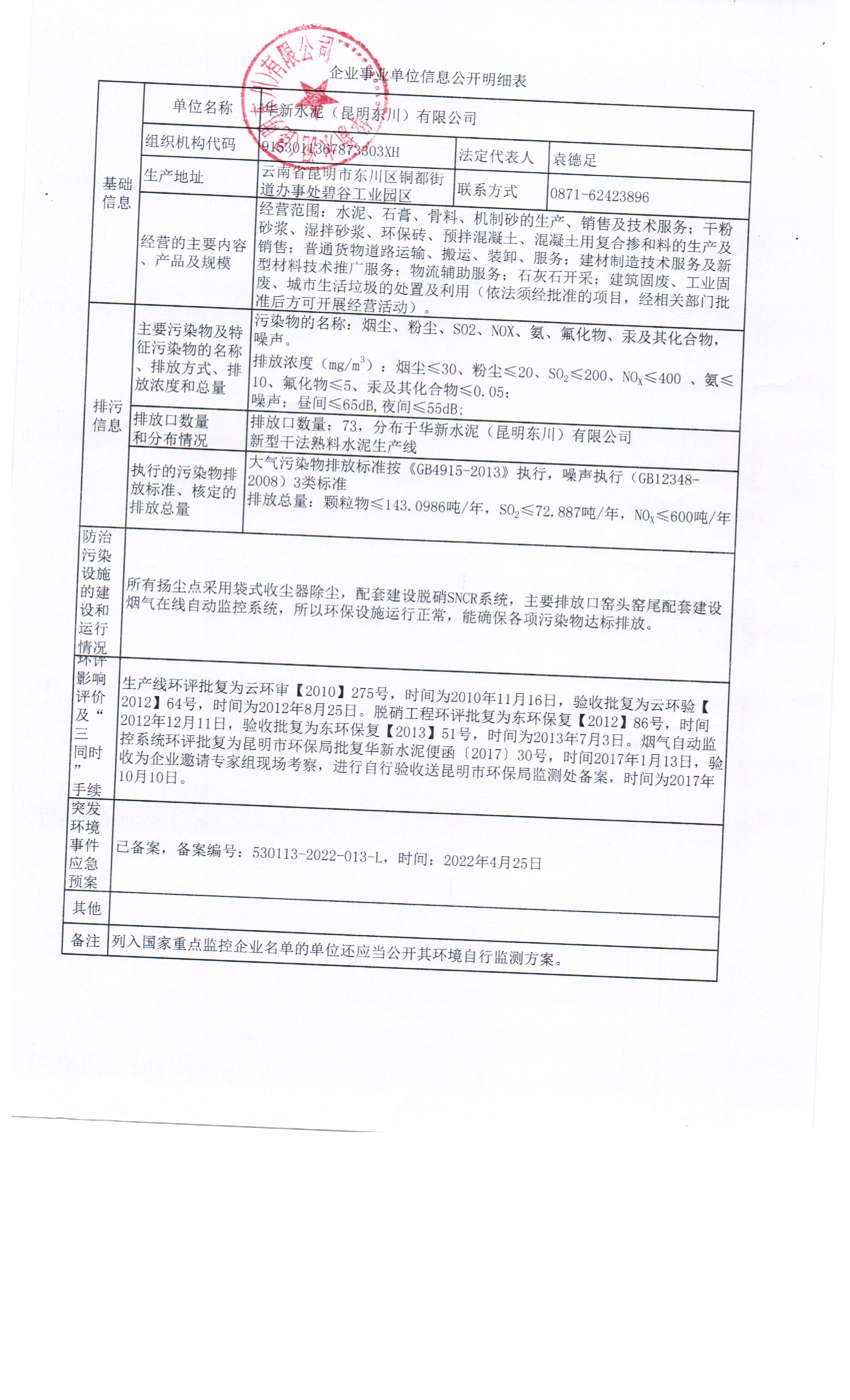 1、華新水泥(昆明東川)有限公司環(huán)境信息公示明細(xì)表
