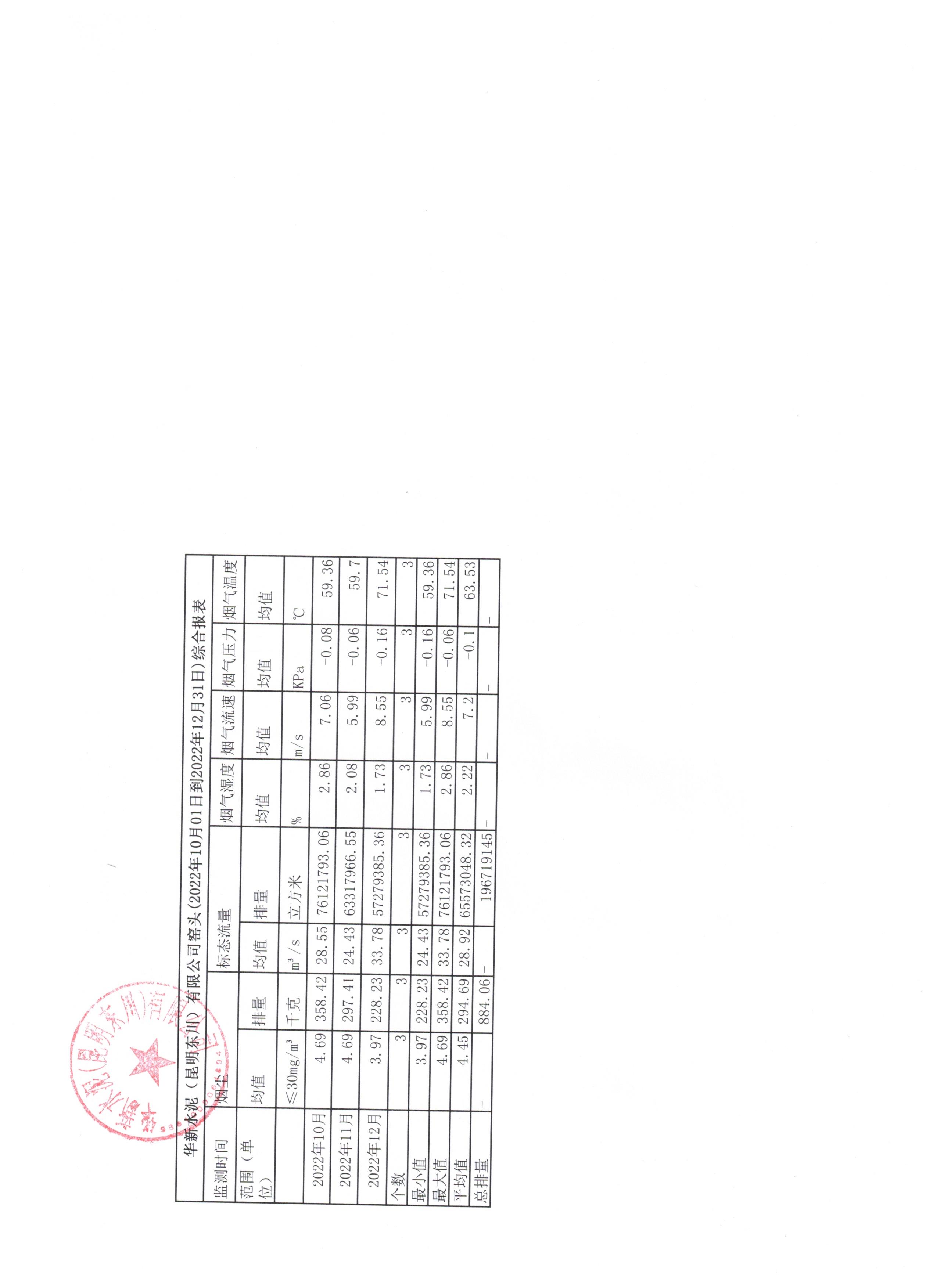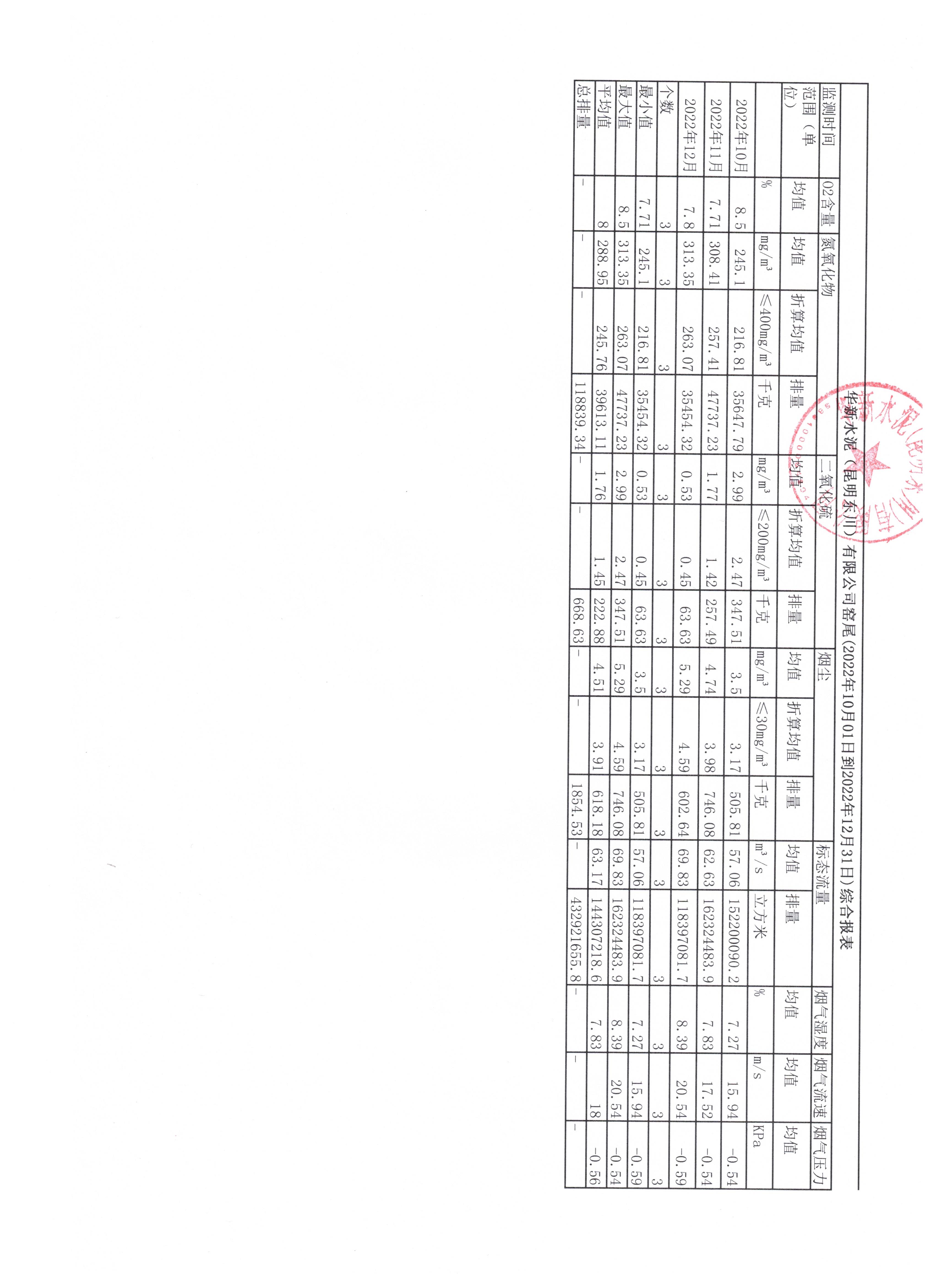 4、華新水泥(昆明東川)有限公司2022年第四季度窯尾煙氣在線監(jiān)測(cè)月平均值季報(bào)表